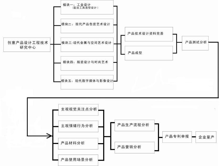 上海创意产品设计工程技术研究中心服装设计与时尚艺术、以工业设计(载运工具造型设计)、现代产品包装艺术设计、现代会展与空间艺术设计、现代数字媒体与影像设计五个模块为重点的工程技术研究中心,对应创意产业,辐射纵横向相关领域,将打造一流的创意产品设计研究新平台,对促进上海创新产业的发展,对提高上海制造业的附加值和竞争力,创立知名品牌,促进制造业的跨越发展,推进创意产品设计产业化等方面将发挥重要作用。服装设计与时尚艺术领域:建立流行信息处理实验室和图形创意实验室;建立高级服装工作室、面料创意工作室,面料再造开发与研究;利用数字化技术,研发构筑快速时尚设计系统,着力开发满足企业快速组织当下设计产品的服务平台;服装数字化创意设计技术开发;开发面向真人的三维虚拟量体试衣系统,构建服装信息→数据处理→面料开发的服装数字化设计工作室。
