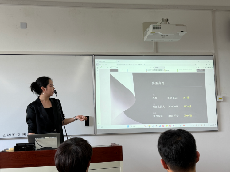 课堂伊始,李诗芸学姐以三个不同身份——模特、双语主持人、舞台导演为主线,生动讲述了自己的职业成长历程。她从在校期间学习表演专业时的初次模特面试经历讲起,由浅入深地分享了作为一名新人模特内心的忐忑与成长。随后,她以2022世界人工智能大会总结会的双语主持经历为例,讲述了那次经历如何点燃她对主持事业的热爱,并由此踏上多次主持工作的新征程。课堂氛围活跃,通过互动提问,以同学们熟悉的“追星”话题为引,娓娓道来自己如何从一名台下观众,成长为担任明星活动总导演的蜕变过程。