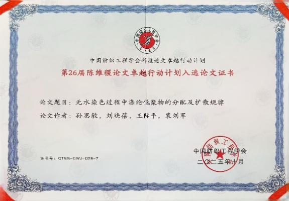 我院国家特聘专家王际平教授团队指导的硕士研究生孙思敏同学为第一作者完成的学术论文《无水染色体系过程中涤纶低聚物的分配及扩散规律》成功入选第26届“陈维稷论文卓越行动计划”。该论文针对传统工艺污水排放量大的痛点,创新性地提出了涤纶无水染色,在实现高效节能的同时显著降低了环境污染。