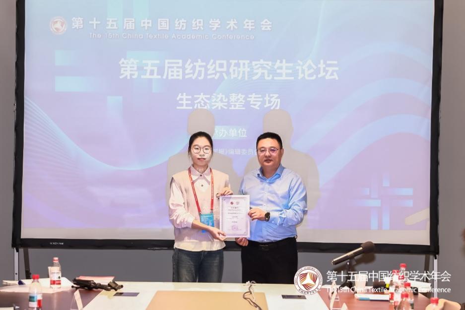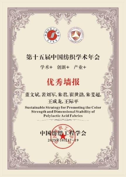 同时,在年会同期举办的优秀墙报评选中,我院董文斌等同学制作的墙报《Sustainable Strategy for Promoting the Color Strength and Dimensional Stability of Polylactic Acid Fabrics》荣获“优秀墙报奖”,在现场展示中获得了评审专家与参会者的高度评价。