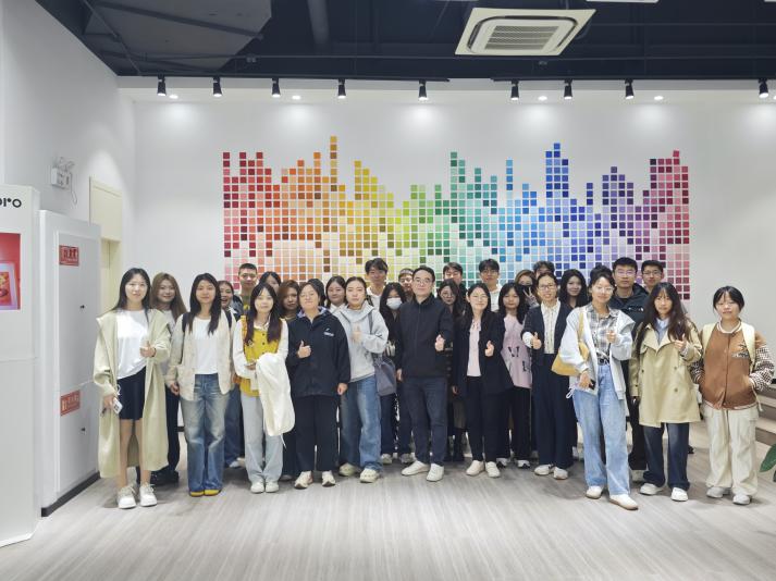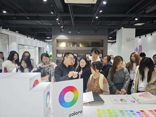 上海元彩科技有限公司技术总监详细介绍了企业产品特色及核心竞争力,并为大家讲述了色彩体系构建原理及应用。之后带领大家参观了公司的色卡展示台,纺织品色卡档案馆等,观摩了色卡生产的各个环节,详细介绍了不同种类色卡的生产流程、产品特色,并带领大家感受了生产色卡的各种加工设备如印刷机、激光裁切机、涂胶机等。丰富多彩的纺织品色卡大大吸引了同学们的目光,大家纷纷驻足在缤纷的色彩海洋中汲取着知识的力量。参观结束后的提问交流环节大家都非常踊跃,双方就关心的科研项目合作、就业、校企育人等方面问题进行了深入交流。未来,双方将在技术研发、成果转化、产学研合作和人才培养及等领域开展全方位合作,共同探索产学研合作新模式。