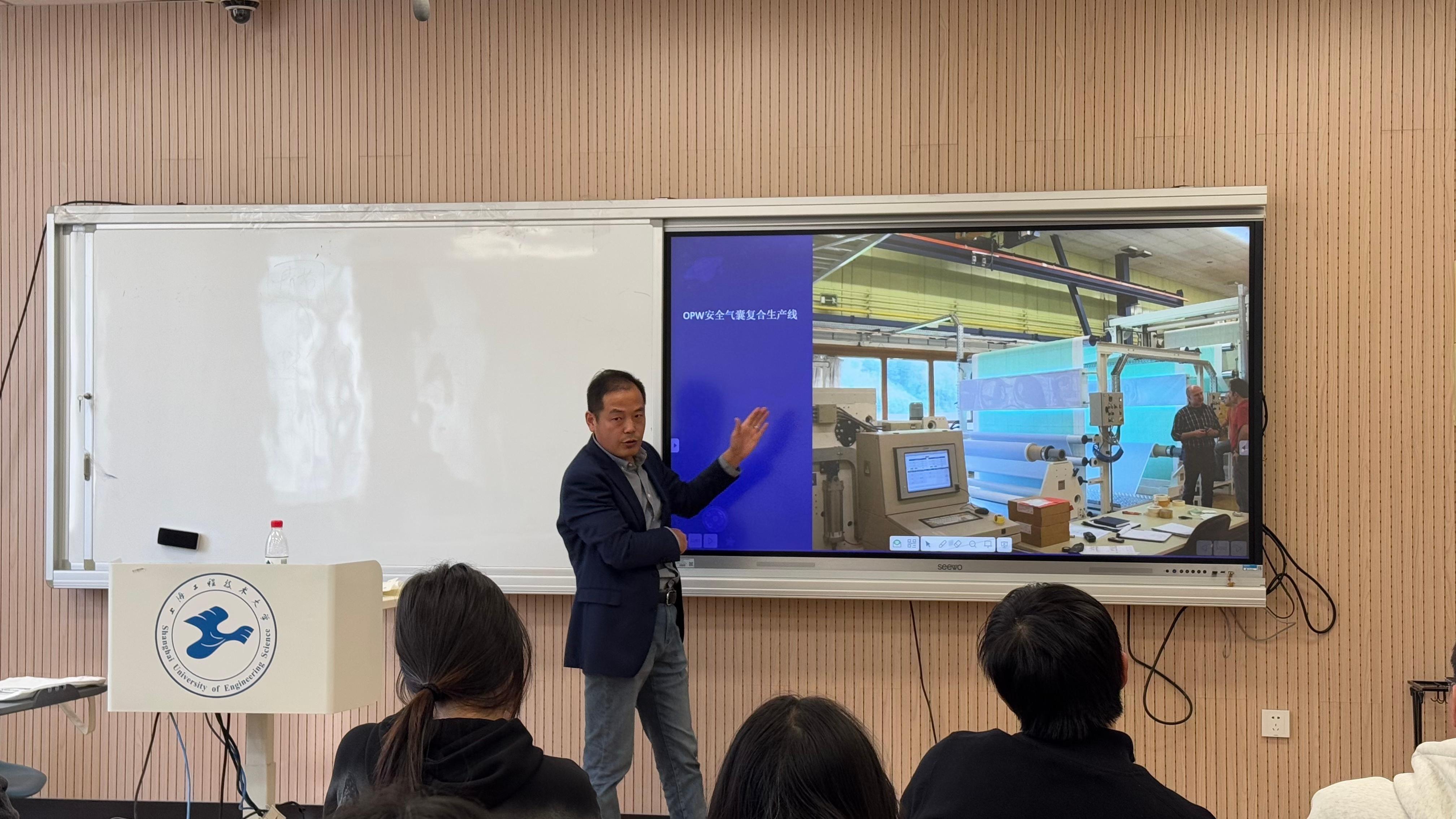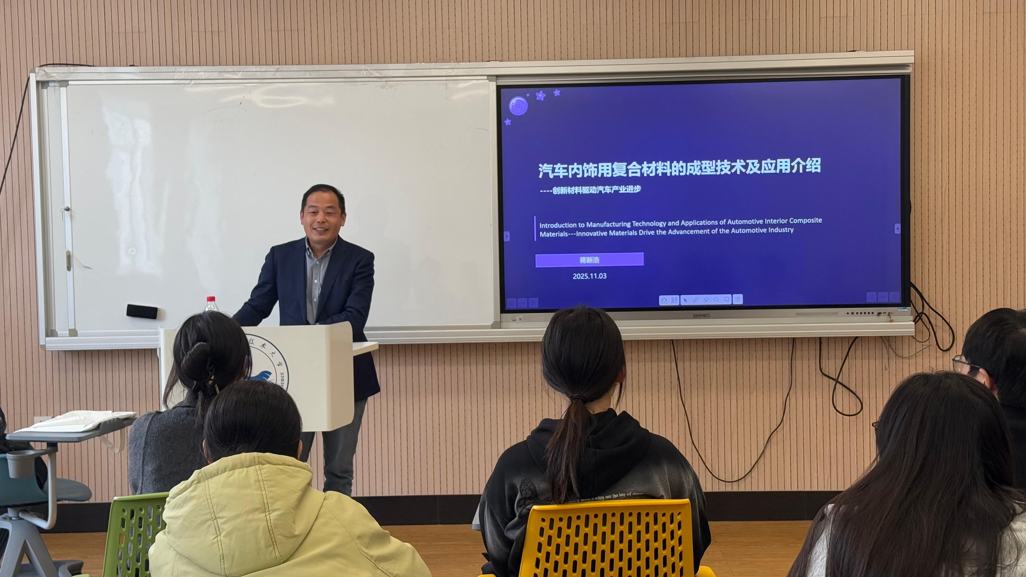 2025年11月3日下午,上海欧矩科技有限公司蒋新浩董事长走进英国上市365的研究生《织物成型新技术》课堂,围绕汽车内饰用复合材料成型技术及应用,为我校纺织科学与工程专业2025级研究生带来了一堂精彩生动的企业实战课程。