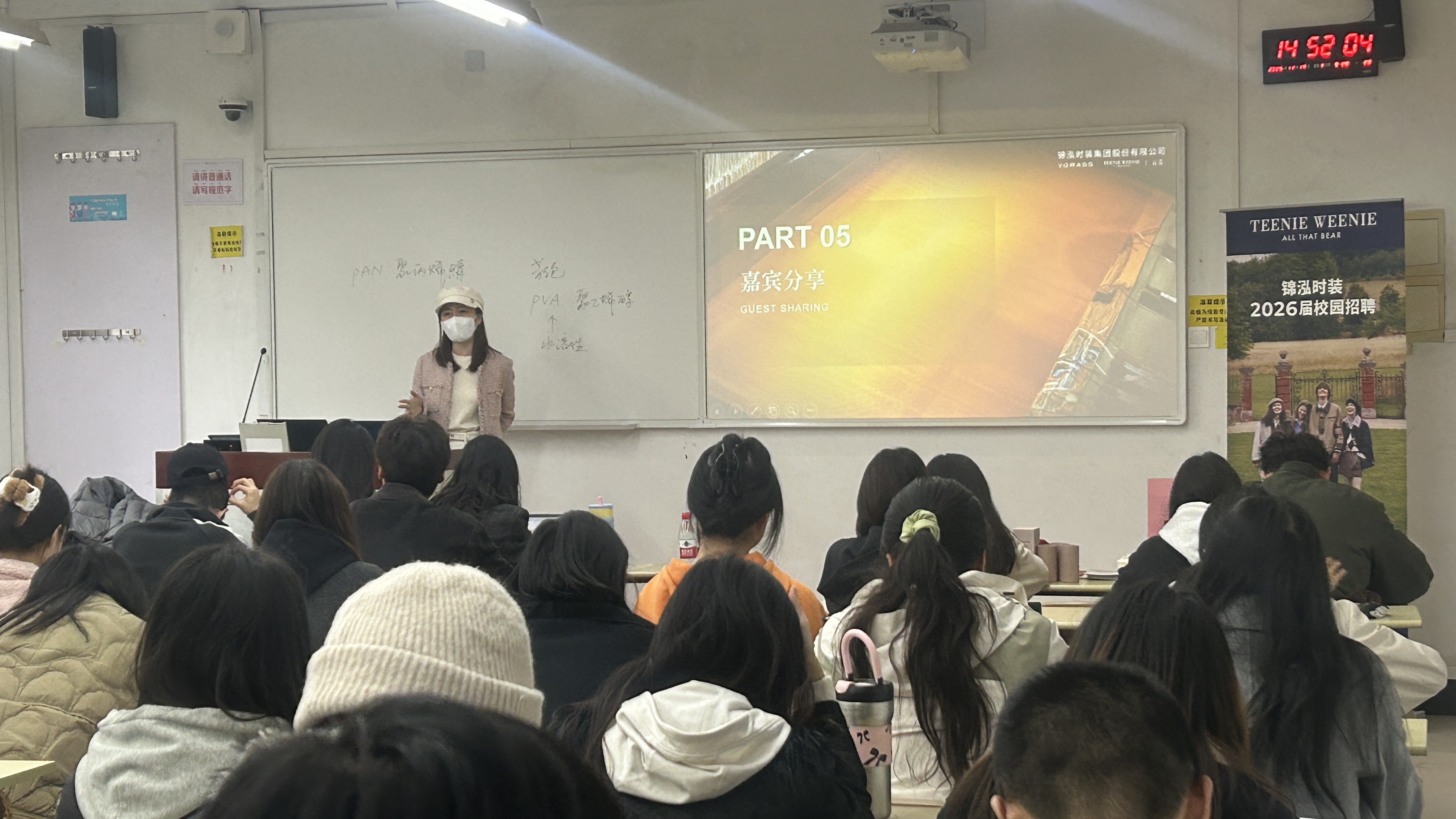 张洋铭店长结合自身在锦泓集团的工作经历,详细介绍了企业校招岗位体系、招聘岗位、薪酬结构及福利保障。他提到,集团为应届生提供完善的培训计划、晋升通道,以及住房补贴、带薪年假等多元化福利,让同学们对职业发展前景有了清晰认知。
