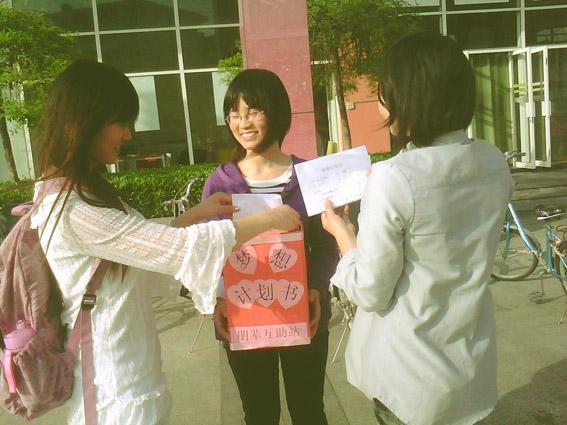 中午,志愿者们在大小食堂门口以及宿舍楼放置了梦想计划书的收集箱,同学们拿到与志愿者派发的“梦想计划书”表格后纷纷填写了自己的愿望,然后投入收集箱中,同时他们自己也保留了一份,以便时时提醒自己对梦醒的追求和计划。许多同学被这种新颖的活动方式所吸引,活动现场气氛热烈。