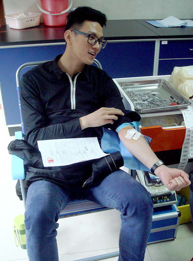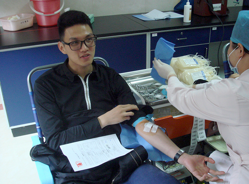 在献血期间,轻松的笑容始终洋溢在何贝丰老师的脸上。在之后的休息聊天中,得知何老师已经不是第一次参加义务献血,此次是他时隔三年后的第二次献血了。当血液从他身体中流出的那一刻,他的脸上依旧荡漾着洒脱的微笑,此时你会感受到原来奉献也是一种幸福。