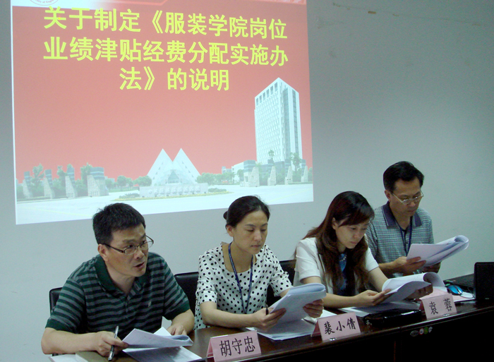 接下来胡院长对《服装学院岗位业绩津贴分配及绩效考核办法》向代表们进行了详细解读,他认真传达了本次考核办法的指导思想,全面系统地介绍了学院新制定的岗位业绩津贴分配及绩效考核办法的总体设想及具体分配方案。整个分配方案及考核办法成型于去年下半年,今年上半年报校人事处备案,经过了长达一年时间的酝酿并广泛征集各方的意见,反反复复修正平衡,最终得以成型,目标是构建以岗位职责为基础、教学科研业绩为导向、绩效目标为核心的绩效考核体系和薪酬分配制度。