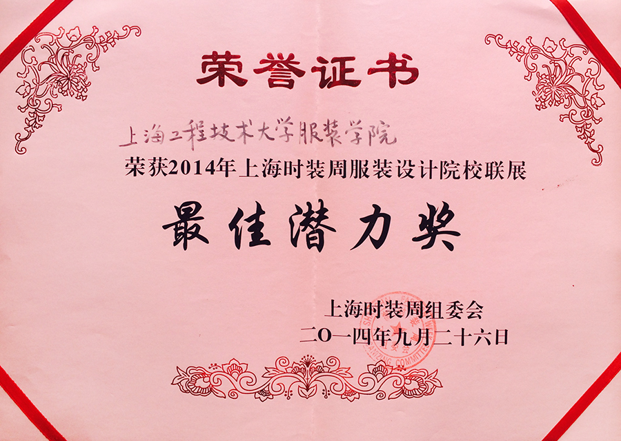 此次展览我院共参展3个系列12套服装,向社会展示了近期服装学院服装设计专业的教学成果和学生创新、创意设计才华和能力。获得了由上海时装周组委会颁发的“最佳潜力”奖,受到界内人士的广泛认可。