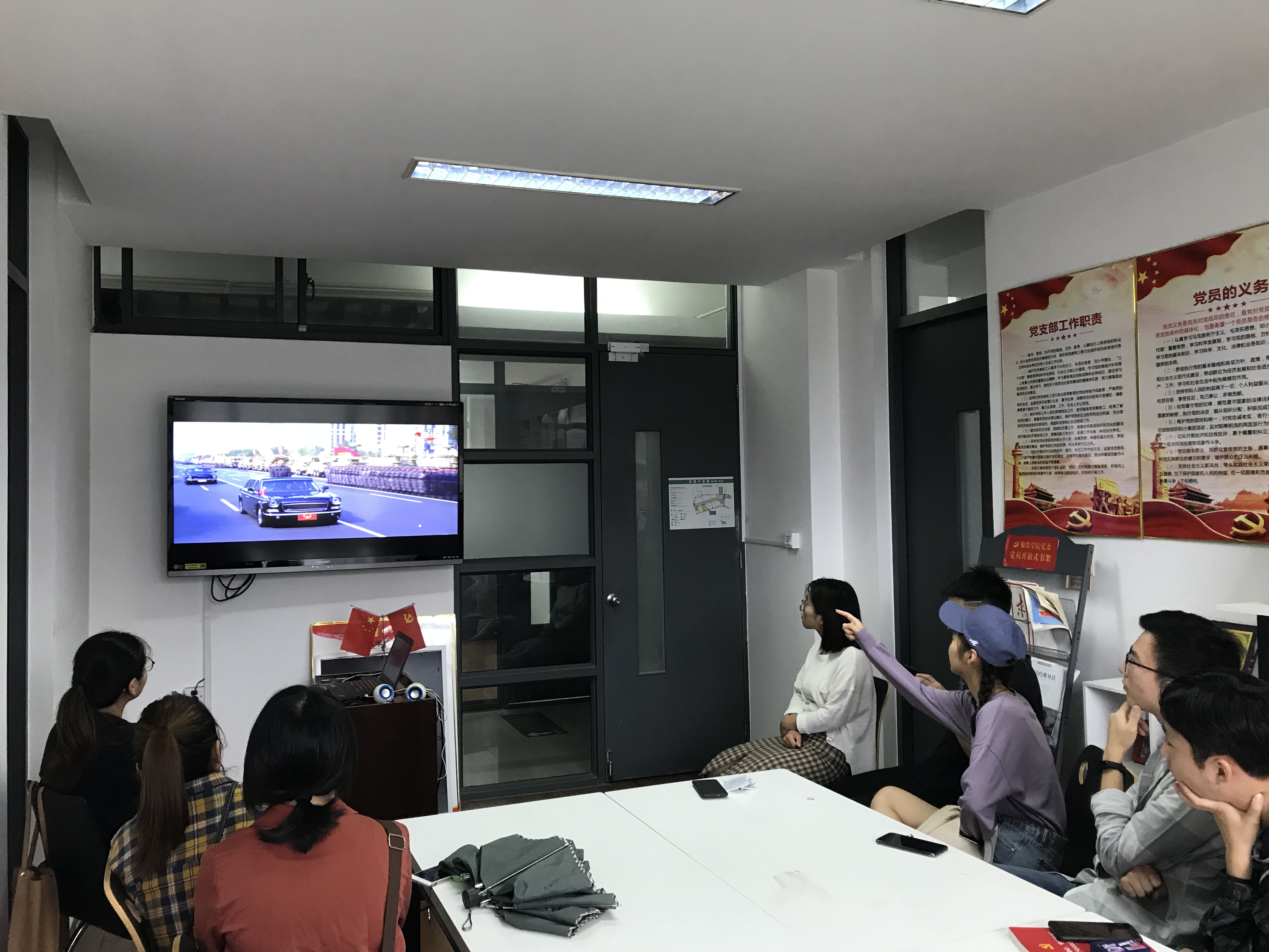 2019年10月1日上午8点,在祖国70周年华诞之际,365英国上市公司服装学院组织留校学生在艺术楼C310观看祖国七十周年大阅兵仪式。