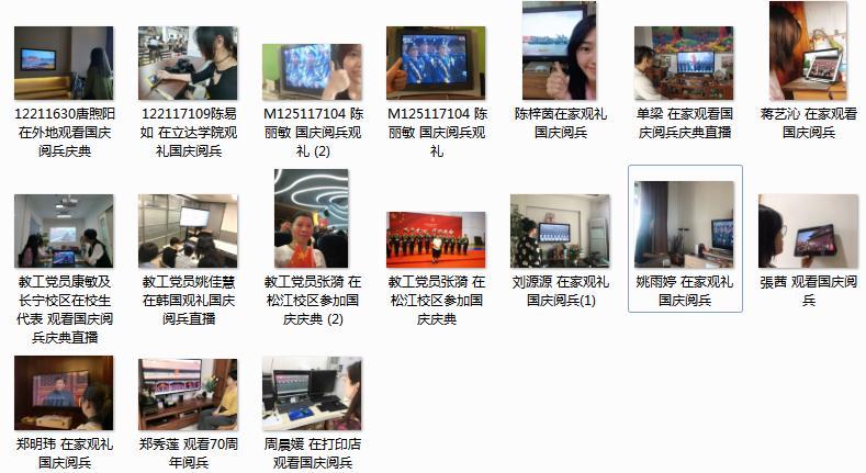 为庆祝新中国成立 70 周年,深入践行“不忘初心、牢记使命”主题教育,按照学校统一部署,服装学院中法学生党支部10月1日组织支部师生观看国庆阅兵庆典直播,并开展主题教育集体学习研讨。支部成员、服装学院党委副书记张漪老师在松江校区参加学校国庆阅兵观礼现场活动,正在韩国攻读博士学位的姚佳慧老师也在海外同步观看阅兵直播,康敏老师在长宁校区组织在校生代表集中观看直播活动,郑秀莲、姚雨婷、唐煦阳、蒋艺沁等学生党员也在家或异地同步观看阅兵直播活动。