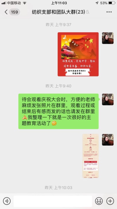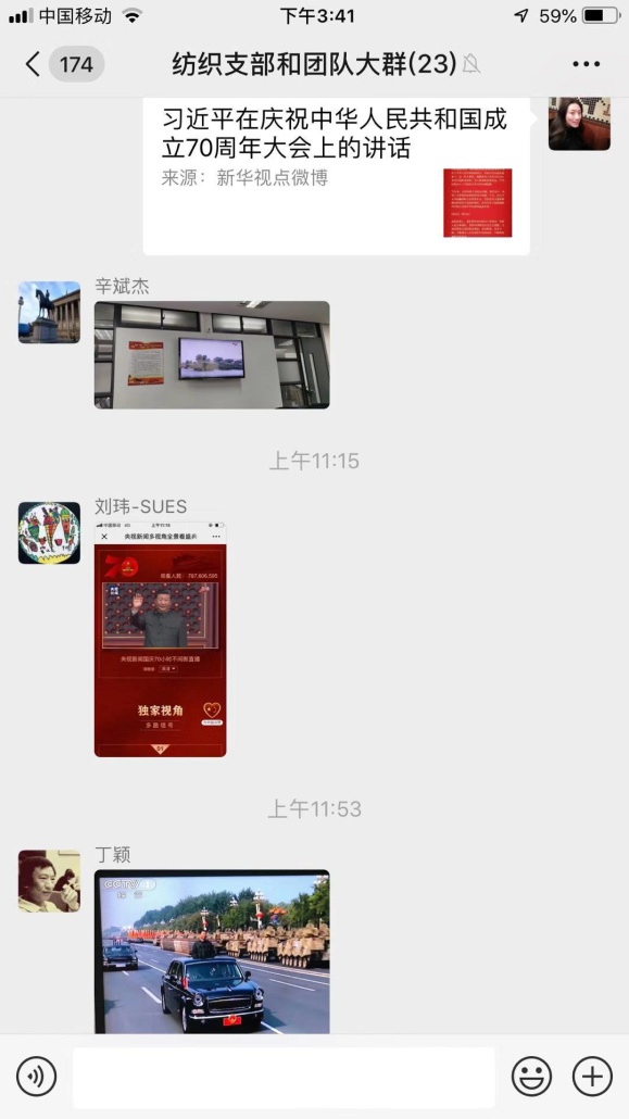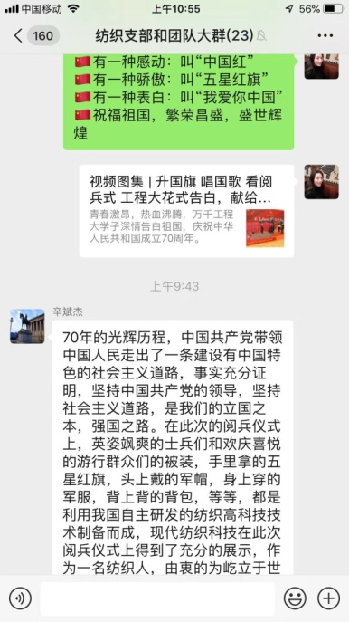 2019101日上午10点,服装学院纺织工程党支部组织全体党员在家观看了庆祝祖国70周年华诞阅兵式,并在支部微信群进行了交流。