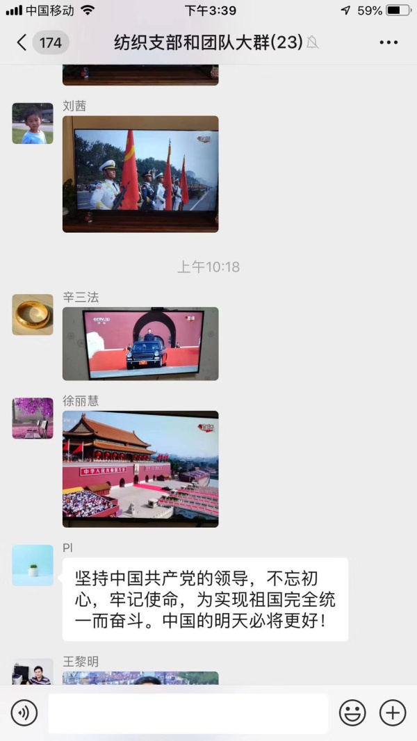 潘虹老师在群里留言“坚持中国共产党的领导,不忘初心,牢记使命,为实现祖国完全统一而奋斗。中国的明天必将更好!”