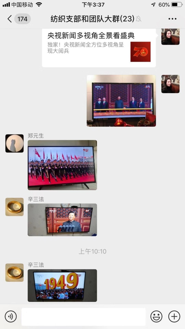 杨群老师在群里发表了“70年的风霜雪雨,70年的艰苦历程,中国一步步从大国走向强国。70年的大阅兵,不仅让我们铭记历史,牢记使命,更是一个让世界各国了解中国、展示我国实力的舞台!加油,中国!”的感言。