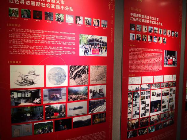 教育部提出建设中国五大“金课”,其中有一堂中国最大的社会实践“金课”——“青年红色筑梦之旅”,是有温度的国情思政大课。“铸金炼课”十五案展之“美遇、艺行——时代画卷中国梦”是展示2019年中国美术学院青年师生在暑期社会实践活动中的过程和育人成果,总结经验,表彰先进,培育和打造有高阶性、创新性和挑战度的社会实践“金课,包含了:“青年筑梦之旅——传承红色基因”、“基层服务之行——助力乡村振兴”、“科艺融合之路——打造未来社区”、“文化传播之途——践行社会美育”、“创新驱动之道——投身中国创造”等5大主题,及党员志愿服务、青马学院专项调研、研究生学术实践等内容。共立项83个实践小分队,共计125人次的教授、老师带队,677人次的学生参与其中,持续推进“双万”金课建设。